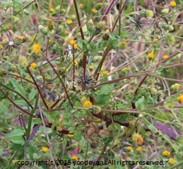 この手の草には、コセンダングサ(小栴檀草)とアメリカセンダングサ(亜米利加栴檀草)があるのをはじめて知りました。種の細いのがコセンダングサで、平たいのがアメリカセンダングサのようです。ひっつき虫には他に、豆にトゲを付けたようなオナモミもありましたね。